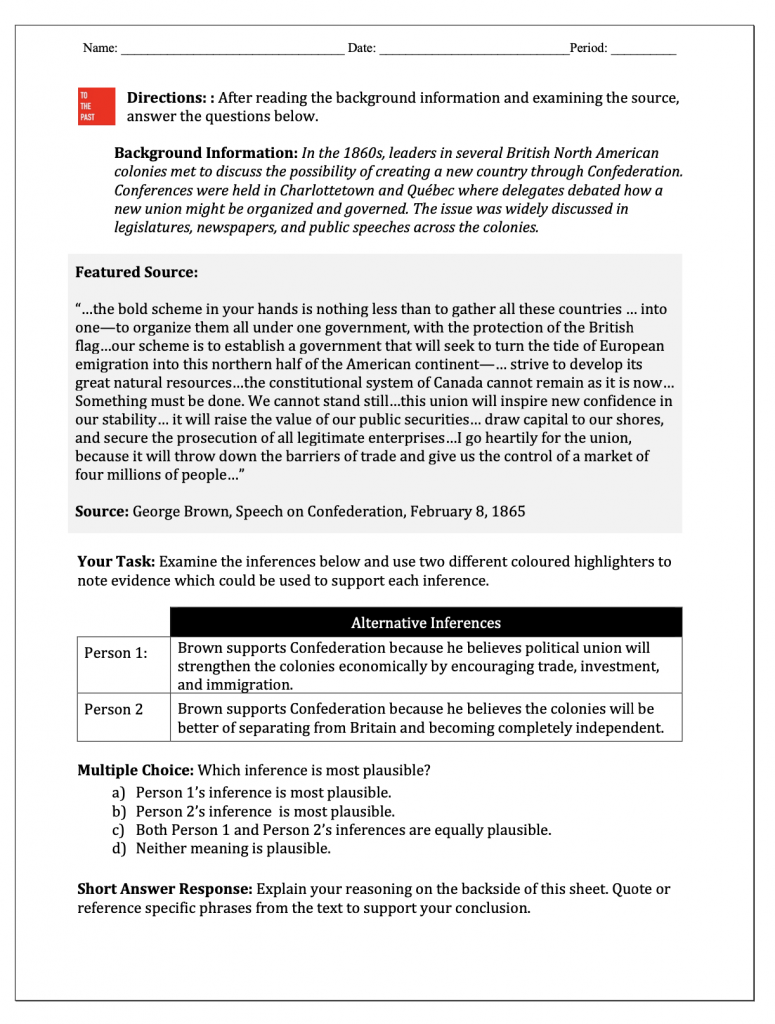 In “Brown on Confederation”, students are asked to evaluate two inferences and identify which is most plausible based on their close reading of a source.