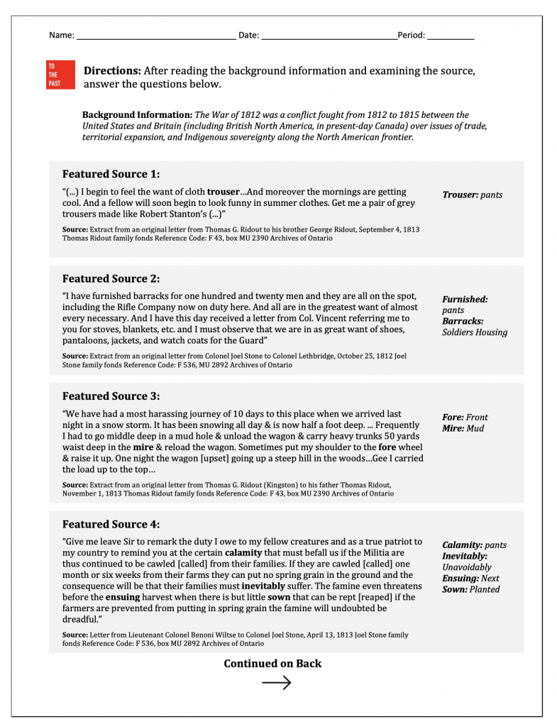 In “War of 1812: Conditions for Participating Soldiers”, students are asked to evaluate two summaries drawn from a selection provided primary sources. This requires them to assess how effectively each response uses evidence to support its claims, the extent to which it avoids sweeping or absolute statements, and whether the interpretation remains consistent with the limitations of the sources.